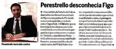 ‘Perestrello desconhecia Figo O secretário de Estado da Defesa desconhecia e foi contra a entrada de Figo na campanha do PS, tendo como contrapartida o contrato com o TagusPark. O CM sabe que os investigadores do processo terão considerado a escuta relevante porque foi aí que conheceram o contrato. Todavia, o que Marcos Perestrello afirma na conversa com Paulo Penedos, assessor jurídico do administrador da PT Rui Pedro Soares, é apontado como uma evidência de que ele não sabia e que se terá manifestado contra. A passagem em que Perestrello fala do que valeriam os 250 mil euros por ano a pagar a Figo em subsídios de desemprego é valorizada a seu favor. Na altura, era candidato à Câmara de Oeiras, mas não tinha funções na campanha. O contrato não foi feito por João Carlos Silva, militante do PS e administrador do TagusPark.’